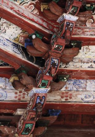 台柱上向外出花篮垂柱承托双挑檐檩,昂部出双下昂,昂头刻成装饰性象鼻状。头昂绘花瓶、暗八仙、竹子等图案。二昂绘回纹。每组双下昂间置花牙子,透雕卷草纹。出柱榫头刻成麻叶状耍头。转角处昂下置斜撑承托,圆雕和合二仙形象。屋面歇山造,翼角起翘,施双飞椽,椽身绘回纹。