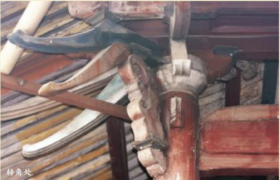 台柱柱头向外出双下昂承挑檐檩,昂嘴刻成象鼻状,二昂上置小斗承托麻叶状耍头,横向承托水波纹雀替和挑檐檩。转角处置撑拱承托头昂,撑拱刻成卷草状,拱下用丁头拱承托。后台柱间置二撑柱支撑内额枋,柱间用穿枋连接,撑柱柱头向外出圆镜装饰物。穿枋与天花枋间用抹灰砖墙隔断,撑柱间用木板壁固定分隔前后台,壁上彩绘“麻姑献寿”图案。两侧穿枋上置扇形匾额: “出将” 、“入相”。戏台后台略低于前台台面。后台设木质踏步与门厅连接。后台和门厅两侧的墙壁上均施戏曲故事彩绘。屋面歇山造,檐椽绘花卉纹,翼角起翘。檐口瓦当齐全。