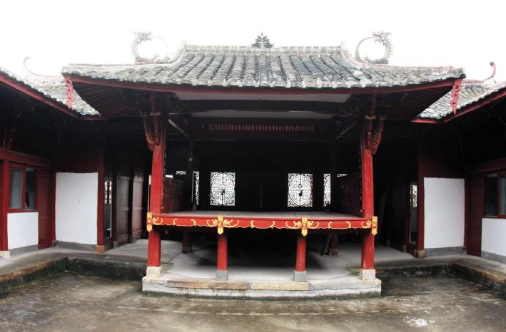 戏台坐南面北偏东,面对正厅。方形平面,木结构表面多被油漆覆盖。戏台进深 3.90 米,离地面高 1.40 米。四角立讹角方木柱,下置花岗岩方柱础承托。正面另添两根撑柱辅撑台面,下置青石方柱础。础下铺设阶条石。戏台台面正面外沿置小垂柱,柱头不露出台面,表面刻成束腰仰覆莲状,柱脚不落地,刻成莲花、仙桃等纹饰。垂柱间用木板联系,木板底部刻出弧线。台面后侧设木质踏步与门厅连接。前台柱内侧悬楹联: “是真是假假里演出真情;亦实亦虚虚里原有实意。”柱头不设栌斗,直接架设檩条。柱间为额枋,枋头做卷杀,枋身略呈弧形,两端线刻卷草纹。枋下雀替已缺失。枋上无坐斗,侧向梁上用瓜柱承托正心枋,瓜柱较细。正心枋直接承托天花,下置小雀替承托。
