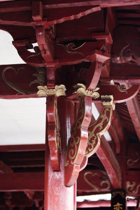 转角处设斜撑置花瓣斗承托由柱身出两跳的异形斗拱,拱身刻卷草纹饰,拱上置两个十八斗承托耍头,纵向承托水波纹雀替和双挑檐枋、檩。斜撑用压地隐起法雕刻卷草纹,下置小插拱承托。角梁外置挂板,透雕卷草纹。屋面歇山造,翼角平滑,正脊青砖垒砌,上用瓦拼砌成莲花状装饰物,不施脊兽。屋面盖阴阳合瓦,盖瓦较密,多用方椽,椽外施封檐板。