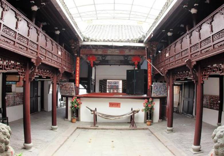 戏台坐南朝北,背靠门厅明间,面对正厅。方形平面,木结构表面多饰彩绘,四角立圆木台柱,下置抹角方柱础,台柱两侧各用一方夹柱石固定。台面外扩成六边形,用木板铺设,前台柱两侧各添一根撑柱,柱下置花岗岩方柱础。前台柱外侧转角处置束腰垂柱,柱头上部刻仰莲纹,束腰以下部分刻万字纹,柱脚不落地,垂柱中部用细枋木与前台柱连接。前台柱阳面悬楹联:“观舞台三百年古迹长存;听戏文五千载历史聚变。”