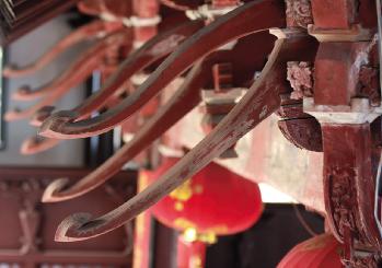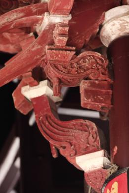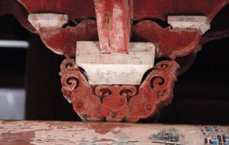 台柱柱头出跳置双下昂承挑檐檩,昂嘴刻出装饰性象鼻状,头昂下置花篮垂柱。二昂昂身较头昂弯曲,上置十八斗承麻叶状耍头和挑檐檩。戏台转角处置三只撑拱,正角小撑拱下用台柱柱头下出的方形拱承托,以压地隐起法雕刻花卉纹。斜角撑拱下用丁头拱承托,斜撑底部刻出小方销,以压地隐起法雕刻凤鸟纹和花卉纹。撑拱上置雕刻莲瓣纹的十八斗承头昂,头昂上置十八斗承托二昂,坐斗纵向出异形斗拱,拱身刻成枫叶状。屋面歇山造,正脊青砖砌筑,外抹白灰,脊身塑如意卷草,脊上部塑有火焰珠,两端脊头灰塑鱼龙吻。檐口瓦当齐全,施虎头纹勾头、戏曲人物图案滴水。
