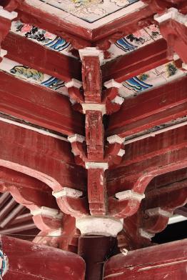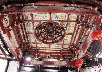 台柱柱头置圆栌斗,斗下柱间为额枋。枋头略做卷杀,线刻卷草纹,内嵌蓝色玻璃片,枋下用水波纹雀替承托,雀替下置丁头拱。额枋内侧施间断式苏式彩画,内容多为戏曲故事。后台柱间原设抱柱与槅扇,现已缺失,后台柱与抱柱间设于两侧的飞罩仍在。额枋上立柁墩,柁墩两面各用压地隐起法雕刻,外侧雕刻花卉纹饰,内侧雕刻蝙蝠纹,蝙蝠的翅膀和尾巴刻成卷草状。柁墩上置讹角坐斗出正心瓜拱承正心枋,坐斗斗底较短,斗耳和斗底均雕刻花卉。内额枋两侧枋头绘出扇面,额枋和正心枋间用木板隔断墙,两侧板墙上书“出将”、“入相”。坐斗向内出三跳,置异形拱承天花枋,逐层递收,拱底刻出束腰瓜楞销,顶层置小斗承托水波纹雀替和天花枋。天花内用枝条做成棋盘状,上附贴棋盘格,格内饰彩绘。彩绘内容有花卉、风景、儿嬉图,有《封神演义》人物以及戏曲故事图案等。棋盘中间设井口枋出跳承五层八角穹窿,竖向设异形拱向心汇合于井顶明镜处,层层收拢,逐层递收。井口枋连接处贴木刻双蝙蝠,蝠身用颜料画出轮廓。拱身做成曲线状,外侧雕刻花卉纹。拱底刻出瓜楞销。拱间设连拱板,拱板断面呈方形,从第四层开始设弧形板。井顶明镜处置盖板,四周环刻卷草纹,盖板中间用压地隐起法雕刻戏曲故事“割须断袍”图案。