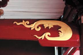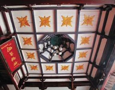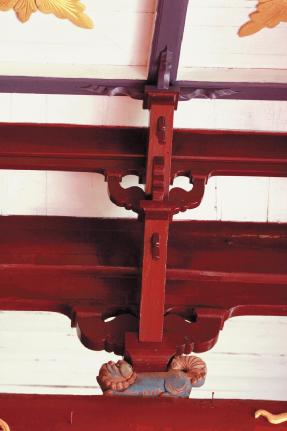 台柱柱头向外出双下昂承挑檐檩,昂嘴刻成装饰性象鼻状,头昂下刻出圆木销,二昂上置十八斗承托耍头和挑檐檩。戏台后台用上下木质踏步连接演出时供演员换装用的门厅二层以及厢房看台。屋面与门厅共用一个悬山顶屋面,不施脊兽。前檐施飞椽,飞椽下压望板,椽身绘回纹。檐口瓦当齐全。