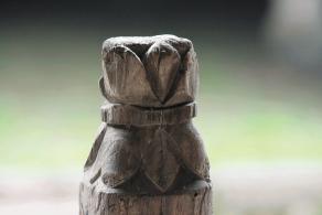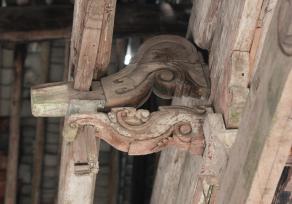 台柱柱头向外出跳置异形拱承托挑檐枋,拱身雕刻精细,曲线优美,多施雕刻,上置花瓣斗承托水波纹雀替和挑檐枋,雀替镂空雕刻卷草纹饰。转角处置斜撑承插拱承托转角挑檐枋,斜撑圆雕幼狮戏球,形象丰满逼真。插拱用剔地起突法雕刻夔龙戏珠图案。屋面歇山造,檐口施封檐板,盖阴阳合瓦。