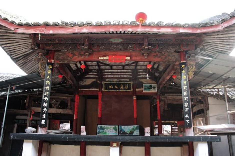 戏台坐南朝北,面对正厅。方形平面,木结构表面多饰彩绘,台面铺设杉木板。四角立圆木柱,前台柱阳面悬楹联:“不大地方可家可国可天下;平常人物为将为相为名臣。 ”正面另添两根圆木撑柱辅撑台面,柱头出台面,刻束腰仰莲状,台柱和撑柱柱下均置青石方形柱础承托。戏台设前后台,后台用木质踏步与门厅连接。内额枋上悬匾额“梨园天地”。抱柱间置屏风固定分隔前后台空间,以红色油漆覆盖。内额枋和穿枋间置编竹壁,壁上绘竹、梅等图案。