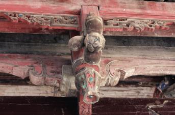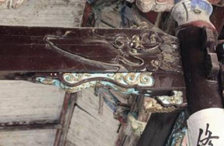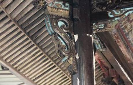 台柱柱头向外出跳承托挑檐枋和挑檐檩,挑檐枋下悬花篮和瓜楞垂柱,垂柱间置挂落花板,现已缺失。外挑檐檩下置花瓣头和水波纹雀替承托,雀替透雕卷草纹饰。转角处置斜撑承托转角花篮垂柱,斜撑雕刻卷草,下用小插拱承托,上刻仰覆莲状斗承转角挑檐枋。老角梁下置一水波纹雀替,雕刻花卉。屋面单檐歇山造,两端脊头塑尖叶状。施飞椽,盖阴阳合瓦。檐口置封檐板,转角檐口置护檐板。