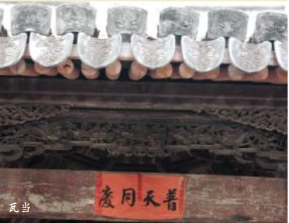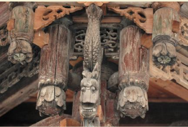 台柱出两跳承托挑檐枋和挑檐檩。第一跳出仰覆莲垂柱,柱间置挂落,透雕夔龙纹、拐子龙纹、凤鸟纹和回形纹等。第二跳出覆莲垂柱,柱间置花牙子,透雕夔龙纹。转角处置斜撑,圆雕鱼龙瑞兽形象。斜撑下置丁头拱承托,刻如意纹。屋面歇山造,脊头灰塑龙吐珠,脊中塑三星天官。檐口施莲瓣纹勾头、花卉纹滴水。
