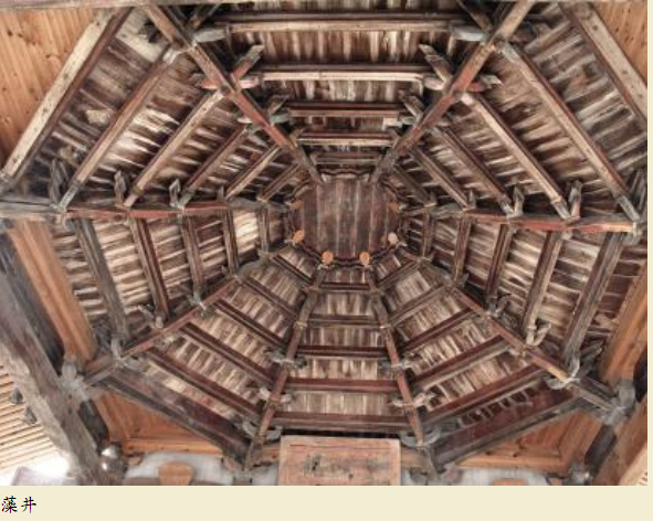 台柱柱头上置圆栌斗,斗下柱间为额枋,枋头略做卷杀。枋下置水波纹雀替和丁头拱承托。抱柱和后台柱间设飞罩。抱柱间用四面木质槅扇固定。上绦环板用压地隐起法雕刻花瓶、仙鹤及琴棋书画等图案,中间的绦环板上用压地隐起法雕刻戏曲故事图案,槅心绘花鸟图案。槅扇背面有戏曲故事图案彩绘。内额枋上置匾额:“可以观”,两侧置扇形木刻件,上刻: “出将”、“入相”。额枋上立坐斗出正心瓜拱承托正心枋,向内出上昂承托井口枋,井口枋出跳承托斗八穹窿,竖向设斗拱越九层向心汇合于井顶中心,逐层递收。斗拱两侧施令拱。拱间设连拱板,拱板断面呈方形,顶层连拱板为弧形。井顶明镜处置盖板,绘双龙图案。