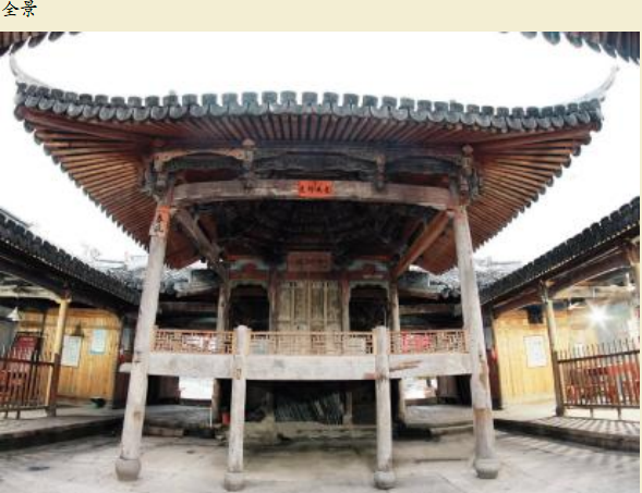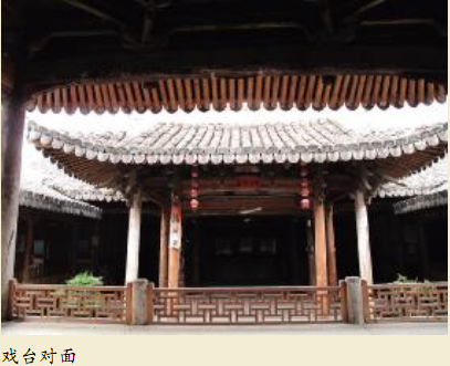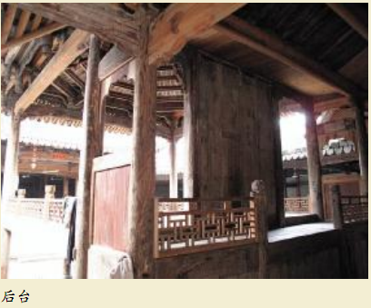 戏台坐西南朝东北,面对月台及正厅。方形平面,台面距地面 1.60 米,铺设厚杉木板。面阔 4.47 米,进深4.41 米。四角立圆木柱,下置鼓形青石柱础承托。正面另添两根撑柱辅撑台面,柱头出台面。戏台台面四周围以几何图案栏杆,栏杆间设望柱,柱头刻出莲瓣状。