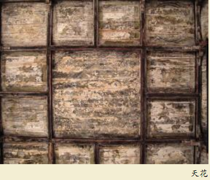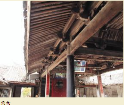 台柱柱间为额枋,枋头略做卷杀,枋下置水波纹雀替承托。枋上立坐斗出正心瓜拱承托正心枋,向内出两跳上昂施令拱承托天花枋。天花内用天花枋做成棋盘状,饰彩绘,现已模糊不清,难以辨认。坐斗向外出外拽瓜拱、施令拱承托挑檐枋和挑檐檩,出柱榫头刻成麻叶状耍头。戏台屋面一直延伸至正厅,采用温州地区较为罕见的三连贯式藻井,三个藻井均为平祺天花。