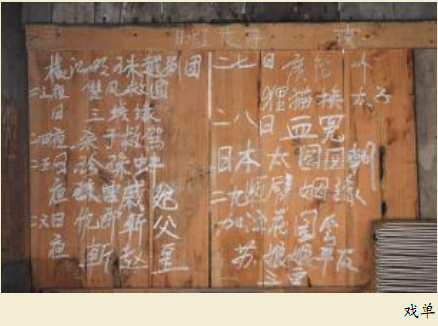 戏台坐东朝西,面对正厅。方形平面。台面铺设厚杉木板,距离地面 1.27 米。戏台面阔4.44 米,进深 4.40 米。前台柱用方木柱,下置青石圆柱础承托。后台柱下置青石方柱础承托。正面另添两根方形木撑柱辅撑台面,下置青石方柱础承托。戏台分前、后台,后台向上连接门厅二层,向下用木质踏步与门厅连接。台柱柱头置圆栌斗,斗下柱间为额枋。斗上置坐斗出正心瓜拱承托正心枋。穿枋和正心枋间用编竹壁。坐斗向外出跳承托挑檐枋和挑檐檩。戏台屋面一直延伸至正厅,采用温州较为罕见的三连贯式,天花现已缺失。后台的木板上有戏单,字迹清晰。