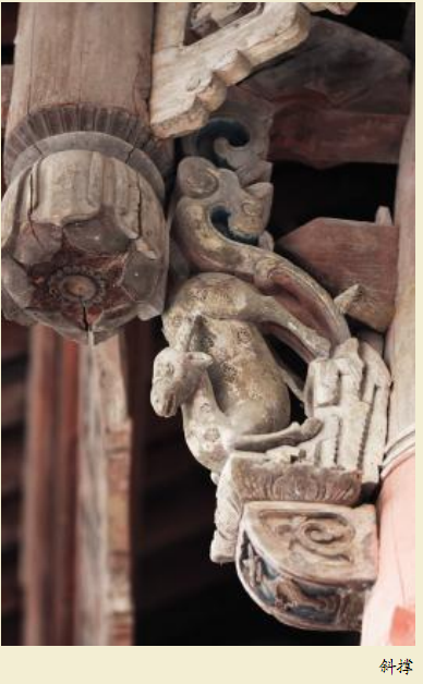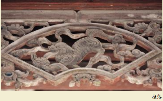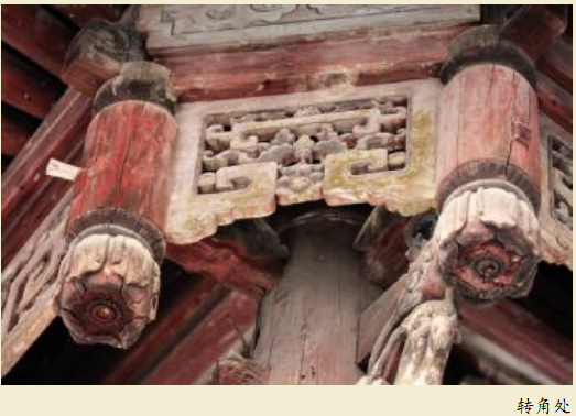 台柱柱头出覆莲垂柱承托挑檐枋和挑檐檩,垂柱间置花板,透雕回形纹、拐子龙纹、凤鸟纹、蝙蝠纹、花卉纹和瑞狮戏球图案等。转角处置斜撑辅撑垂柱内侧,斜撑圆雕幼鹿待哺形状。斜撑下置丁头拱承托,雕刻卷草纹、花瓶纹等。角梁处老梁头刻如意纹和花卉纹。屋面歇山造,施双飞椽。脊头脊兽已缺失。脊中灰塑戏曲人物,已残缺不全。戗脊上灰塑瑞兽头。檐口有瓦当,大部分已缺失,勾头图案为花卉纹,滴水图案为葡萄纹。