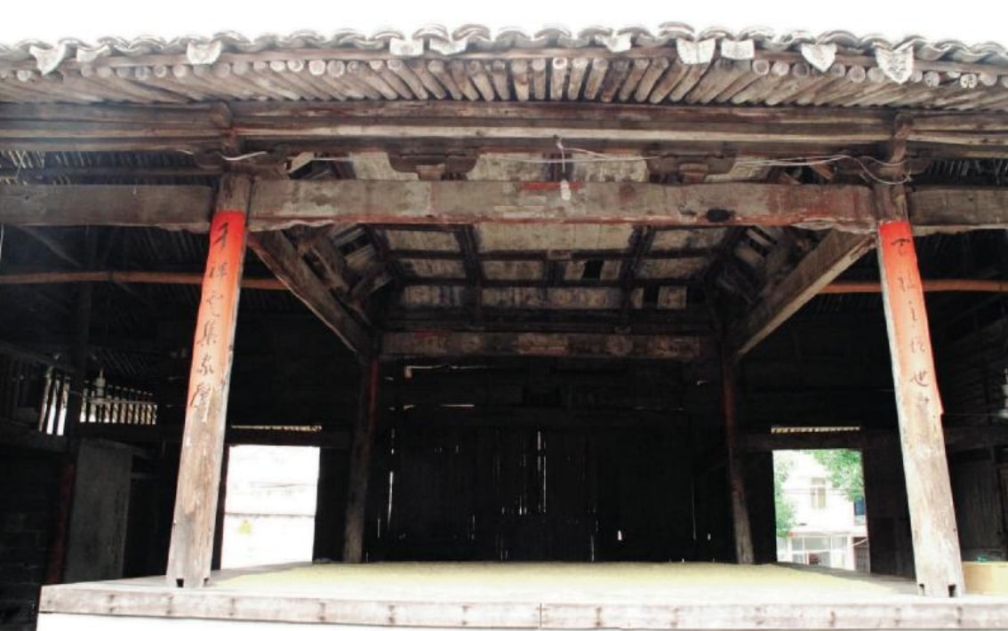 戏台坐西北朝东南,面对正厅。方形平面,四角立圆木柱。台面已改用水泥浇筑,离地面高1.36米。戏台面阔 5.97 米,进深5.97 米。台柱柱头置圆栌斗,斗下柱间为额枋,枋头略做卷杀。枋下置水波纹雀替承托。额枋上置坐斗出正心瓜拱承托正心枋,内额枋和两侧梁上置坐斗直接承托正心枋,向内出两跳上昂承托平祺天花。天花内用天花枋做成棋盘状,棋盘内饰彩绘,已模糊不清。屋面悬山造。檐口施花卉纹滴水,部分已缺失。