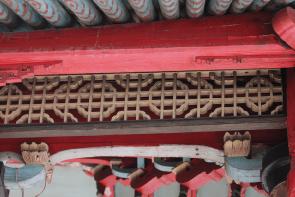柱头置圆栌斗,斗下柱间为额枋。枋头做卷杀,线刻夔龙纹和卷草纹。枋下置雀替承托,用压地隐起法雕刻花卉纹、回形纹。前额枋置匾额“藏歌舞”。内额枋置匾额“醒世奇观”,落款时间:“咸丰元年辛亥岁冬葭月吉旦。”两侧置扇形木匾,上书“出将”、“入相”。枋上立坐斗出正心瓜拱承托正心枋,坐斗斗底较长,上部小斗刻成花瓣状。坐斗向内出四跳扶承天花枋。每跳置异形斗拱,拱身雕成曲线状,拱上置小斗施令拱承托天花枋,拱底出束腰仰覆莲短木销,顶层承托水波纹雀替和天花枋。平祺天花用天花枋做成棋盘状,棋盘格内及棚板均不饰彩绘,棋盘中心用曲线枋木围成几何图形。