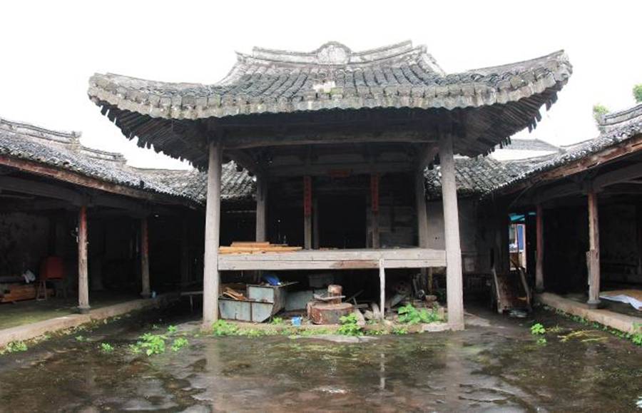 戏台坐东北朝西南,面对正厅。方形平面,木结构表面饰彩绘,台面铺设厚杉木板。前台柱立圆石柱,柱脚做成八面形,直接落地,不设柱础,上部砌圆。后台柱为讹角方石柱,亦不设柱础。前台柱阳面刻楹联: “是世上箴规原非幻境;真人间榜样莫做闲看。 ”后台柱间置方形抱柱,柱脚不落地。柱间槅扇已缺失,抱柱和后台柱间设雀替,雕刻回形纹。台柱头上刻出圆栌斗状,柱间为额枋。枋头做卷杀,用压地隐起法雕刻夔龙纹、升龙纹和卷草纹。枋下雀替部分已缺失,仅剩梁下一个雀替,透雕回形龙纹饰。透榫用束腰覆莲销固定。内额枋与正心枋间用编竹壁。枋上置鹰嘴瓜柱出正心瓜拱承正心枋,向内出跳置异形斗拱,拱上置十八斗承托天花枋,十八斗两侧出异形斗拱。异形斗拱拱身曲线优美,拱底刻出束腰小木销。每组四个斗拱勾连汇合,顶层斗拱承水波纹雀替和天花枋,天花内用天花枋做成棋盘状。棚板饰神话传说、戏曲故事等彩绘图案。棋盘中心置一圆盘,圆盘中心彩绘双龙戏珠图案,四周设圆盘枋,枋上环刻卷草纹,并嵌有蓝色玻璃片。圆盘枋外设四个瓶状木刻件,刻有如意纹和花卉纹。