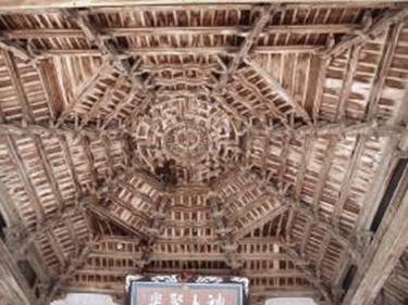 台柱柱头置圆栌斗,斗下柱间为额枋,枋头做卷杀,线刻夔龙纹。额枋下置水波纹雀替承托,用压地隐起法雕刻卷草纹、花卉纹。出柱榫头刻出麻叶状耍头。额枋上置匾额“蜃忠楼”。内额枋置匾额“神人聚乐”。额枋上立坐斗置正心瓜拱承托正心枋,坐斗斗底较长,瓜拱拱身刻卷草纹,斗部刻成花瓣状。坐斗向内出三跳置异形斗拱扶承天花枋,施令拱,组成三层斗四穹窿,逐层递收。斗拱做成曲线状,拱身刻出花瓶纹、花卉纹和铜钱纹等,嵌有蓝色玻璃片,拱底雕出束腰短木销。戏台内转角处斗拱向外出异形雕刻件,刻成石榴、寿桃和花篮等形状。顶层斗拱向外出异形拱,刻出花瓶纹和道家八仙等形象。天花枋至第三层处加短趴梁、抹角梁形成斗八穹窿,置四层,逐层递收。拱间设连拱板,拱板断面呈方形,斗八穹窿从第二层开始使用弧形板。明镜处用枝条贴出八卦九宫格,相连间用枝条贴成大大的回形纹,四周贴有刻出花朵形状的木刻件,中间嵌蓝色玻璃。明镜中心置双层圆盘枋,层层向上隆起,层层递收。两层圆盘枋上均刻卷草纹,嵌蓝色玻璃。圆盘中心处置盖板,线刻阴阳太极纹。