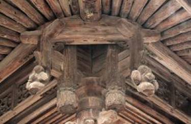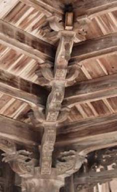 台柱柱头出两跳承托挑檐枋和挑檐檩。第一跳出仰覆莲垂柱,柱间置花板,透雕卷草纹,大量使用蓝色玻璃。第二跳出花瓣头,两侧置花牙子,透雕卷草纹。角梁处仔、老梁用压地隐起法雕刻葵花纹、如意纹、蝙蝠纹和兽头形象。椽外施封檐板,以压低隐起法雕刻卷草纹。屋面歇山造,脊头灰塑游龙吻兽,脊中塑暗八仙,垂脊和戗脊上灰塑八仙。