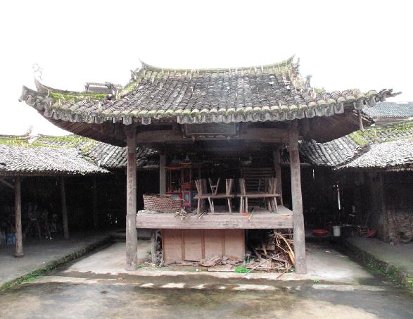 戏台坐南朝北,面对正厅。方形平面,台面铺设厚杉木板,离地面高1.52米。四角立花岗岩台柱,柱身下部刻方,上部砌圆,柱础连刻。前台柱阳面刻楹联: “剧演曲台据黄粱幻境;奇传优孟补青史遗编。 ”后台柱为讹角石柱,柱间抱柱与槅扇均不存,前后台设木质踏步连接。柱头栌斗青石砌筑,有圆、方之分,斗下柱间为额枋。枋头做卷杀,线刻卷草纹、夔龙纹等。前额枋悬匾额“可以观”。内额枋悬匾额“通古今”。枋下置雀替承托,用压地隐起法雕刻卷草纹、回形纹等。枋上立鹰嘴瓜柱,上部开卯口直接承托雀替和正心枋,瓜柱线刻花瓣纹和如意纹,雀替用压地隐起法雕刻卷草纹。向内出异形斗拱置小斗施令拱扶承天花枋和雀替,斗拱刻出优美曲线,拱底刻出束腰短木销,雀替透雕回形纹。每组四个斗拱勾连汇合于上天花,天花用天花枋做成棋盘状。顶层天花枋下置花瓣头和挂落,透雕蝙蝠纹、花卉纹和回形纹等,并嵌蓝色玻璃。棋盘中心向上隆起做成覆斗藻井。井顶明镜处外部刻方,内部用天花枋做成花环状。花环内置圆盘枋,环刻万字纹。