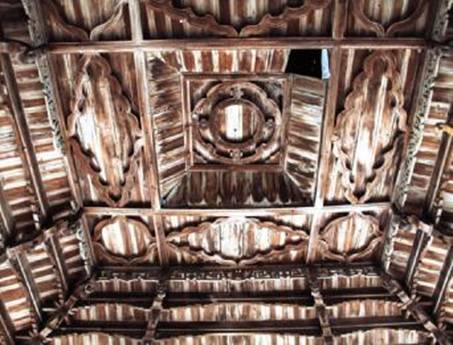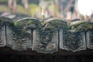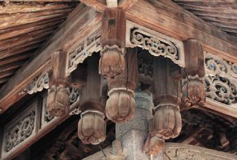 台柱柱头出两跳承托挑檐枋和挑檐檩。第一跳出束腰瓜楞垂柱,柱间置花板,透雕如意纹,花板下置花牙子,透雕回形纹,大量使用蓝色玻璃。第二跳出束腰覆莲垂柱,柱头刻出莲藕和含苞待放的莲花状。转角处的垂柱间置花板和花牙子,花板透雕花卉纹和回形纹,花牙子透雕卷草纹。戏台屋面歇山造,翼角起翘,正脊两端塑尖叶状脊头,戗脊上灰塑如意卷草纹。檐口滴水图案为荷花纹、公鸡纹和团寿纹。
