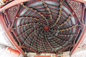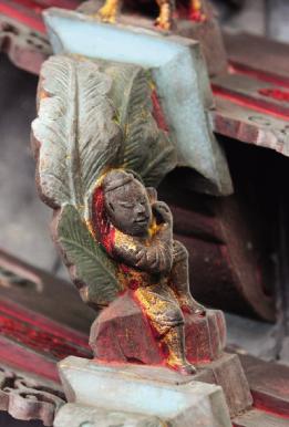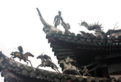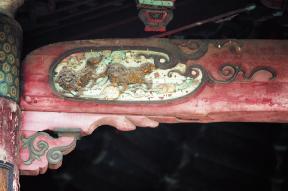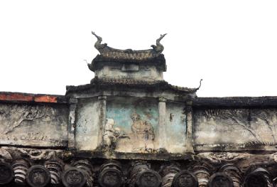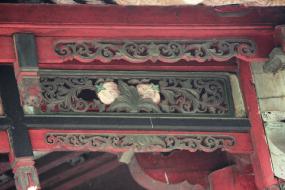 戏台坐南朝北,面对正厅。方形平面,木结构表面多饰彩绘。面阔 5.70 米,进深 5.30米。台基用块石垒砌,四角立圆木柱,下承圆鼓青石柱础。台面用杉木板铺设,离地面高 1米。前台柱阳面刻楹联:“二五步走遍天下;六七人百万雄兵。 ”正面另添两根圆撑柱承托台面,下置讹角青石方础。柱头置圆栌斗,斗下柱间为额枋。枋头做卷杀,用压地隐起法雕刻双狮戏球图,线刻卷草图案。枋下用水波纹雀替承托,枋上立鹰嘴瓜柱,柱头开卯口承井口枋和正心枋,上承圆形螺旋藻井。四角轩棚处嵌回形龙纹板。藻井穹窿用十六组斗拱竖向盘旋汇合于中心井顶,其中八组升至第六层连拱板,其余八组越九层连拱板至井顶,连拱板身刻万字纹,板底镂空雕刻卷草。斗拱拱头圆雕各种戏曲人物形象,外沥金抹粉,显得富丽堂皇。井顶盖板用压地隐起法雕刻“空城记”故事。其余井棚板仅漆单色颜料,未绘图案。第一层设龙头昂螺旋,至顶层设龙尾昂收拢,藻井略内旋,似卷龙,寓水龙防火。戏台台柱柱头出两跳下昂承托双挑檐檩,第一跳用花篮垂柱、仰覆莲垂柱,向外做成装饰性象鼻昂,垂柱间置花板。第二跳昂上置小斗出麻叶状耍头,间有小垂柱,柱头圆雕雏狮戏球,形象逼真,垂柱和花瓣头间置挂落,多雕刻卷草缠枝纹饰。戏台屋面重檐歇山造,两檐各施飞椽,椽头绘团寿纹。正脊两端灰塑龙吻,中间灰塑重檐式亭阁,围脊上灰塑幼童造型。垂、戗脊上塑三国人物形象,独具一格。屋面翼角起翘,屋檐下檐角梁头雕兽头。檐口施虎头纹勾头、花卉纹滴水。后角柱间原用木质落地槅扇封隔前后空间,现已缺失,后台处用木质踏步连接门厅明间。门厅为二层硬山式,面阔五开间,进深四柱九檩,二层前廊设看台,台柱间设栏杆,有万字和回纹等样式。山墙青砖砌筑,前部做出墀头。屋面合铺小青瓦。