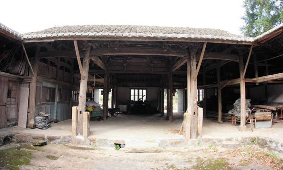 戏台坐西北面东南,木结构表面多饰彩绘,现台板已缺失。四角立圆木柱,柱下用花岗岩方柱础承托,前台柱用两方花岗岩夹柱石固定,夹柱石尺寸不一,外高内低。台柱柱头置圆栌斗,斗下开榫口置额枋,枋头做卷杀,用压地隐起法雕刻草龙图案。枋下用刻有水波纹的雀替承托,雀替三面雕刻蝙蝠、卷草等图案。内台柱间置一平板枋,枋上立瓜柱,柱头绘回形纹饰,瓜柱间串于穿枋,枋头做出卷杀,两端线刻卷草旋涡图案。穿枋和正心枋间用编竹壁。额枋上立鹰嘴瓜柱,柱身刻蝴蝶,柱上开卯口置三踩斗拱承正心枋和长趴梁。正心枋出跳承井口枋,十字相交之井口枋围成两层斗四穹窿,转角三角轩棚处彩绘蝙蝠图案。至第三层处加短趴梁围成斗八穹窿,拱身刻成优美弧线,拱底刻出束腰仰覆莲小垂柱。斗八穹窿用四层斗拱,向心汇合于井顶,层层递收。斗拱间用连拱枋连接,枋做成多段连续圆弧状,线条十分优美。井顶置盖板,盖板及井壁均饰彩绘,有《三国演义·水淹七军》《沉香阁·上楼寻夫》、《三官堂·上寿弹唱》和《琵琶记·大骗小骗》以及戏曲剧目名称《渔家乐》《连环记》和《雷峰塔》等。戏台前台柱柱头出两跳承托双挑檐檩,第一跳置花篮和束腰仰覆莲垂柱,柱头沥金抹粉,垂柱间置花板,透雕花卉纹、蝙蝠纹及“囍” 、“寿”等民间吉字图案。花板下悬小挂落,透雕“平” 、“安” 、“万”字纹等。第二跳出花瓣头,外沥抹金粉,挑檐檩下置水波纹雀替。屋顶为前厅屋面,上铺小青瓦。