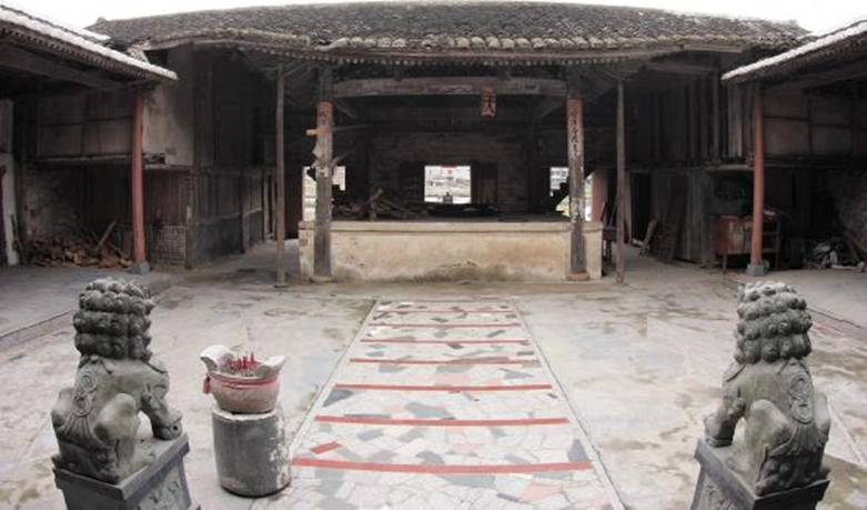 戏台坐南面北,平面呈正方形,长 4.60 米,木结构表面多饰彩绘。台面分前、后台,后台设于门厅前台柱和戏台后台柱间。四角立圆木柱,柱下用圆形石础承托。正面另添两根擎台柱,柱头置坐斗支撑角梁,与台柱间用雕花板枋连接,疑为后人添加。戏台设前后台,后台用木质踏步连接。