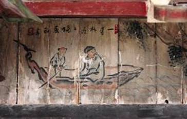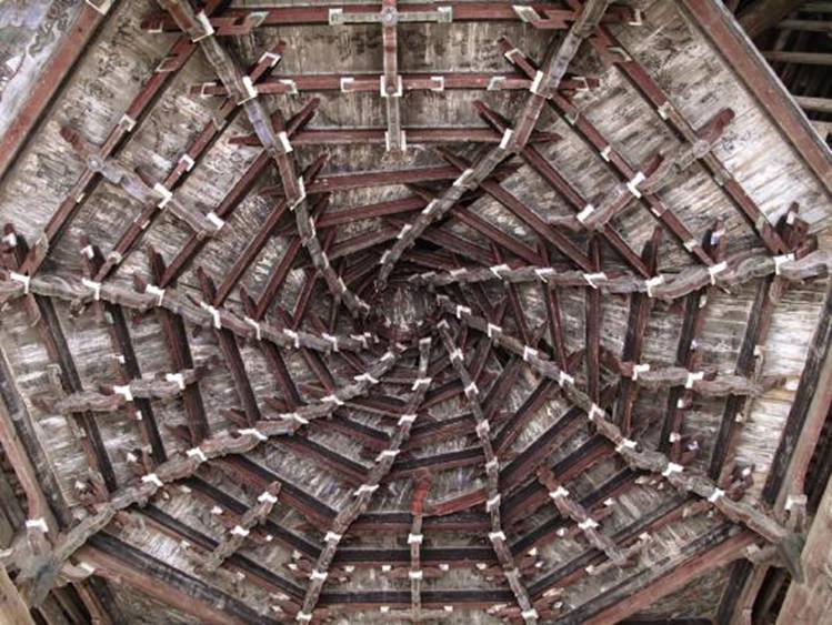 台柱柱头置圆栌斗,斗下为额枋。额枋枋头有卷杀,枋下用刻有卷草纹的雀替承托。雀替各面均施雕刻,有蝙蝠、卷草、石榴等图案。枋上立短柱开卯口承正心枋和井口枋,四角轩棚处彩绘蝙蝠图案。枋上出跳置斗拱勾连九层十六束汇合于井顶,其中八束起于第二层,止于第四层连拱板处。斗拱拱身雕成曲线状,拱底置覆莲销。另八束汇合于井顶,斗拱间用连拱板连接,板底悬挂落,透雕卷草和回形纹饰。第五层设龙头昂盘旋而上,至顶层设龙尾昂螺旋收拢。井顶设盖板,盖板彩绘神话故事“汉钟离东游”,下用小垂柱,柱头雕刻成花瓣头状,柱身向外斜出如意花篮异形拱,垂柱间置花板。井壁绘“渔归图” 、“嵇康醉酒” 、“五禽戏” 、“摹瓯香” 、 “一肩挑尽夕阳春” 、“滞客思乡”等字。