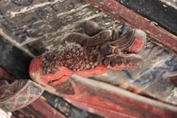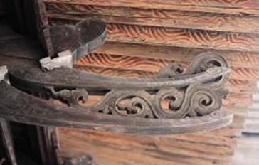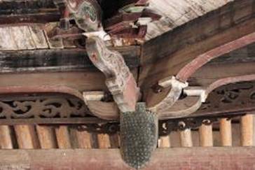 台柱柱头出两跳下昂承托双挑檐檩,昂头刻成装饰性象鼻状,两层昂间置卷草状装饰物。底层下昂上置斗承花板,花板镂雕卷草缠枝。顶层下昂置斗承托麻叶状耍头和外挑檐檩,檩下置月牙儿。戏台上为门厅屋面,前檐口施飞椽,檐椽椽身绘祥云纹,上压连檐板,雕刻如意卷草纹,飞椽断面呈方形。
