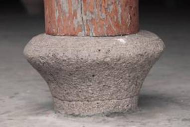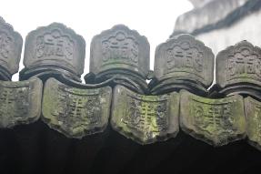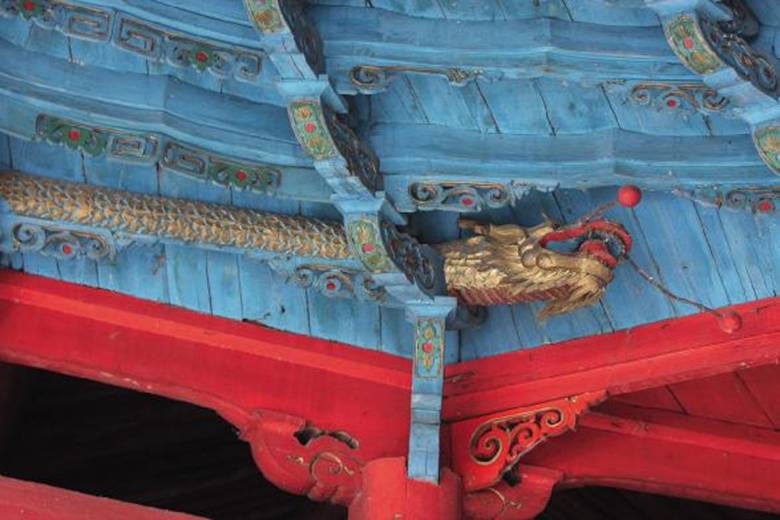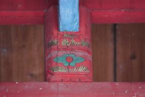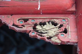 戏台台柱柱头出两跳承托双挑檐檩,第一跳出覆莲垂柱,底部嵌有蓝色玻璃片,垂柱间置花板,花板镂空雕刻花卉卷草和蝙蝠动物,大量使用蓝色玻璃片。第二跳出花瓣头,花瓣头间置挂落,镂雕如意卷草纹。屋面为前殿屋面,前檐口施飞椽,施福字纹勾头、寿字纹滴水。