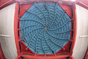 戏台坐东南朝西北,面对正厅。方形平面,台板已拆卸。四角立圆木柱,下承圆形花岗岩柱础。前台柱阳面漆书楹联:“大义千秋大忠千秋传;周法万载唐礼万载芳。”台柱柱头置圆栌斗,斗下开榫口置额枋。额枋枋头做卷杀,用压地隐起法雕刻凤鸟图案和卷草纹,凤尾嵌以蓝色玻璃。枋下用水波纹雀替承托,雀替镂空雕刻龙头图案,龙头嵌蓝色玻璃。枋上立鹰嘴瓜柱、短柱,柱上各开卯口,承正心枋和井口枋围成井口,井口枋下用镂空卷草纹雀替承托,枋心下悬花篮垂柱。枋上出跳置斗拱勾连十六束盘旋十层汇合于井顶。其中有八束止于第六层连拱板处,另八束汇合于井顶,斗拱间用连拱板连接,板底悬挂落和花牙子,透雕卷草和回形纹饰。第一层设龙头昂螺旋,至顶层设龙尾昂螺旋收拢,顶层坐斗挑出花篮雕刻件,向前下方斜置。井顶设盖板,用压地隐起雕刻戏曲故事“孙悟空大战红孩儿”,四周环刻花瓣纹。