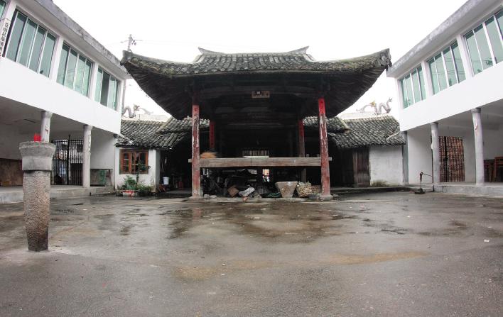 戏台坐东朝西,台面离地面高 1.25 米,用两层厚杉木板铺设。四角立围径为 22 厘米的圆木柱,下承圆鼓形石础。戏台用槅扇分隔前后台空间,槅扇现已缺失。后台设于门厅后台柱和戏台内台柱间,低于前台面,并用两方长条石加以辅撑。后台用木质踏步与门厅连接。台柱柱头置额枋,枋头做卷杀,两端线刻夔龙图案,枋下用回形纹雀替和丁头拱承托,雀替底部雕刻如意挂件图案。内外台柱头各置方、圆栌斗,采用斗口跳做法,承托扣嵌正心枋,额枋与正心枋间用二朵平身科斗拱联系,欹部较长。正心枋出跳置斗拱承井口枋,十字相交之井口枋围成两层斗四穹窿,至第三层处加短趴梁围成斗八穹窿,斗八穹窿五层,向心汇合于井顶,层层递收。拱身刻成曲线状,拱底刻出瓜楞销,拱上置斗承托令拱和麻叶状耍头,斗拱间用连拱枋连接,枋下悬挂落,镂空雕刻卷草纹饰,顶层斗拱向外做出花篮异形拱。井顶置盖板,盖板及井壁均素面无饰。