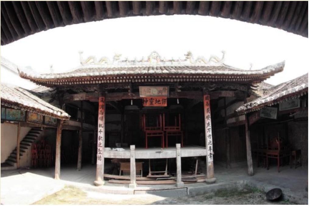 戏台坐东朝西偏南,面对正厅。方形平面,木结构表面多被油漆覆盖,台面铺设厚杉木板。四角立圆木柱,柱下置鼓形青石柱础承托。正面另添两根撑柱辅撑台面,柱头出台面,柱下置青石方柱础承托。抱柱间置四面槅扇固定分隔前后台,后台柱和抱柱间设飞罩,绦环板上用压地隐起法雕刻花卉纹。前台柱阳面贴楹联:“风调雨顺祝千秋之圣德;国泰民安庆万方之丰年。”