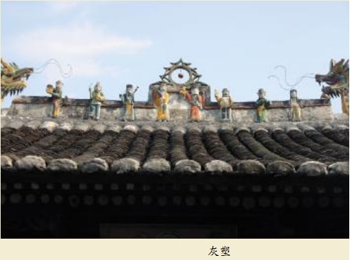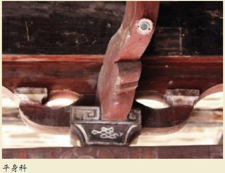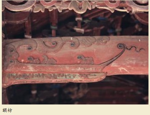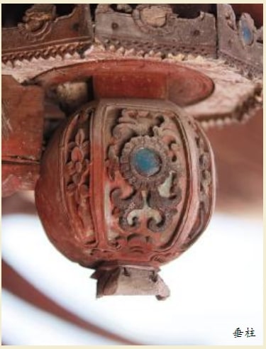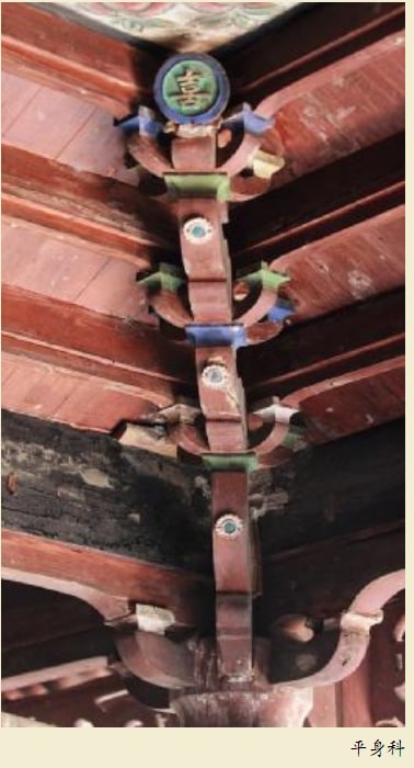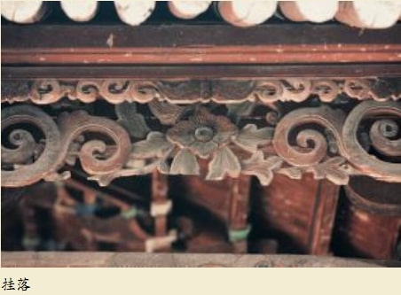 台柱柱头出花篮垂柱承托双挑檐檩,垂柱间置挂落,透雕卷草纹、花卉纹等。垂柱柱身向外出双下昂,昂嘴刻出象鼻状,二昂上置十八斗承托榫头。出柱榫头刻出麻叶状,榫头间置挂落,透雕卷草纹、“蝠倒”纹、寿桃纹、回形纹等。戏台门厅共用一个屋面,屋面硬山顶,盖阴阳合瓦。脊头灰塑双龙戏珠形象,脊上灰塑八仙。