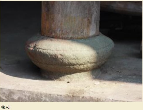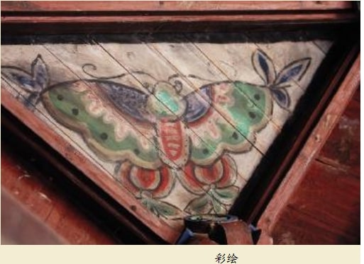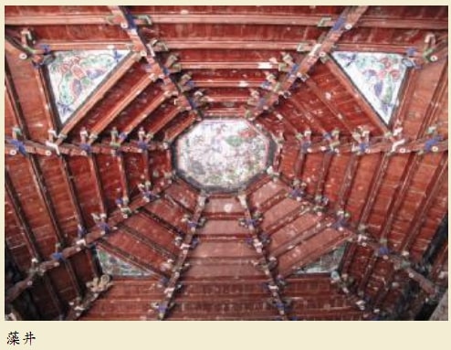 台柱柱头置圆栌斗,斗下柱间为额枋。枋头做卷杀,用压地隐起法和线刻法雕刻卷草纹,并嵌蓝色玻璃。额枋下置雀替承托,用压地隐起法雕刻蝙蝠纹、花卉纹,花卉中心嵌有蓝色玻璃。额枋和梁的内侧饰彩绘,多绘戏曲故事和花卉图案。额枋上立坐斗出正心瓜拱承托正心枋,坐斗上绘回形纹、盘长纹等。坐斗向内出异形斗拱施令拱扶承天花枋,组成三层斗四穹窿,逐层递收。拱底刻出花卉纹,花卉中心嵌有蓝色玻璃,转角处向外出圆镜雕刻件,刻“福” 、“禄” 、“寿”、“喜”等字。至第三层处加短趴梁、抹角梁形成五层斗八穹窿,逐层递收至明镜处。拱间设连拱板,拱板断面呈方形。最顶层连拱枋内贴异形斗拱,刻出花篮形状。井顶明镜处置盖板,盖板上彩绘三国故事“三英战吕布”,四角平祺处彩绘蝙蝠和寿桃图案。