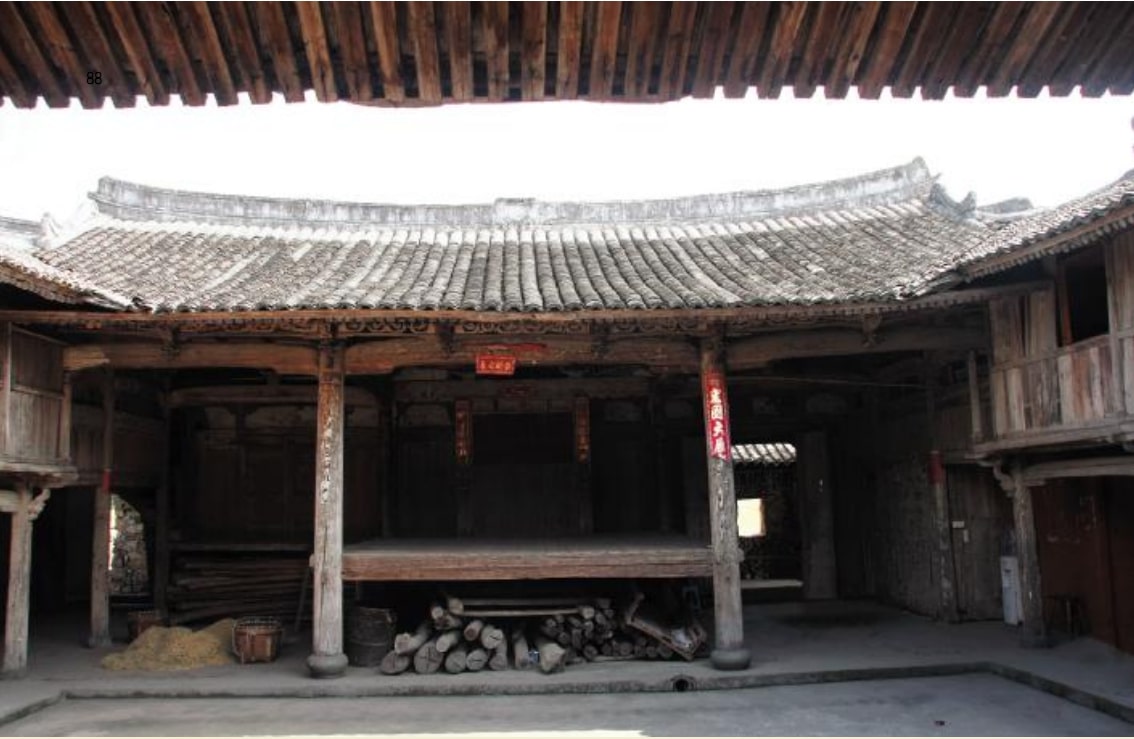戏台坐东朝西,面对正厅,方形平面。台面铺设厚杉木板。四角立圆木柱,下置鼓形青石柱础承托。后台柱间设方形木抱柱,台柱与抱柱间置飞罩。抱柱间置四面木质槅扇固定分隔前后台。绦环板用压地隐起法雕刻戏曲人物形象,“文化大革命”破四旧时遭破坏。后台用木质踏步与门厅连接。穿枋和正心枋间用编竹壁。台柱柱头置圆栌斗,斗下柱间为额枋。枋头做卷杀,线刻夔龙纹、卷草纹。枋下置雀替承托,刻卷草纹和回形纹。额枋上立坐斗出正心瓜拱承托正心枋,向内出跳承托天花枋,组成三层斗四穹窿,逐层递收。斗拱做成曲线状,拱底刻出花卉纹,拱上施令拱承井口枋。至第三层处加短趴梁、抹角梁形成五层斗八穹窿,逐层递收至盖板处。拱间用连拱板,连拱板断面呈方形。顶层连拱板下置花瓣头垂柱,柱间置花板,透雕如意纹。花板下置花牙子,透雕回形纹。井顶明镜处置盖板,不施雕刻。