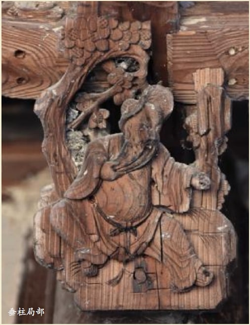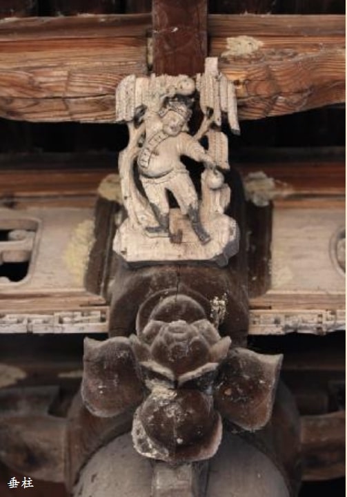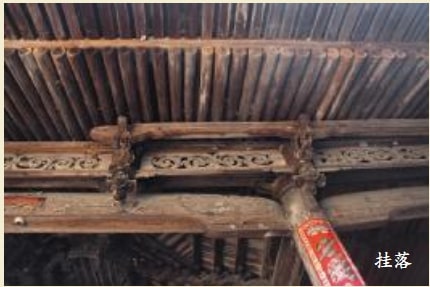 台柱柱头出花瓣头垂柱承托挑檐枋和挑檐檩,柱间置花板,透雕卷草纹。花板下置花牙子,透雕回形纹。出柱榫头刻出麻叶状耍头。花瓣头垂柱和耍头间置木刻件承托,透雕戏曲