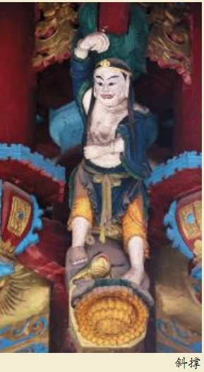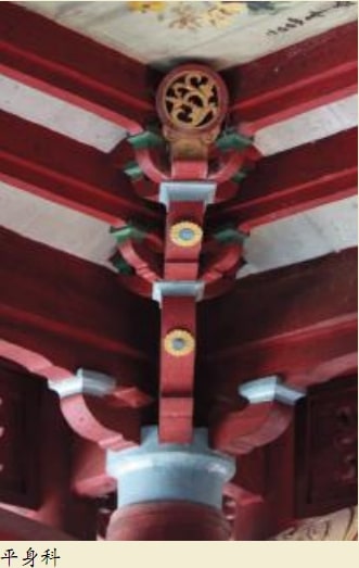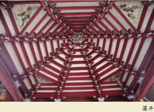 台柱柱头置圆栌斗,斗下柱间为额枋。枋头略做卷杀,线刻卷草纹、夔龙纹,并嵌有蓝色玻璃。枋下置雀替承托,刻有卷草纹和花卉纹等。额枋上立坐斗出正心瓜拱承托正心枋。坐斗向内出跳承托天花枋,组成两层斗四穹窿,逐层递收。斗拱做成曲线状,拱底刻出花卉纹,花卉中嵌蓝色玻璃。拱上施令拱承井口枋,二层转角处向外出装饰雕刻件,透雕卷草纹饰。至第二层处加短趴梁、抹角梁形成八层斗八穹窿,逐层递收至盖板处。拱间用连拱板,连拱板断面呈方形。井顶明镜处置盖板,绘游龙图案,四角平祺处绘花卉纹。