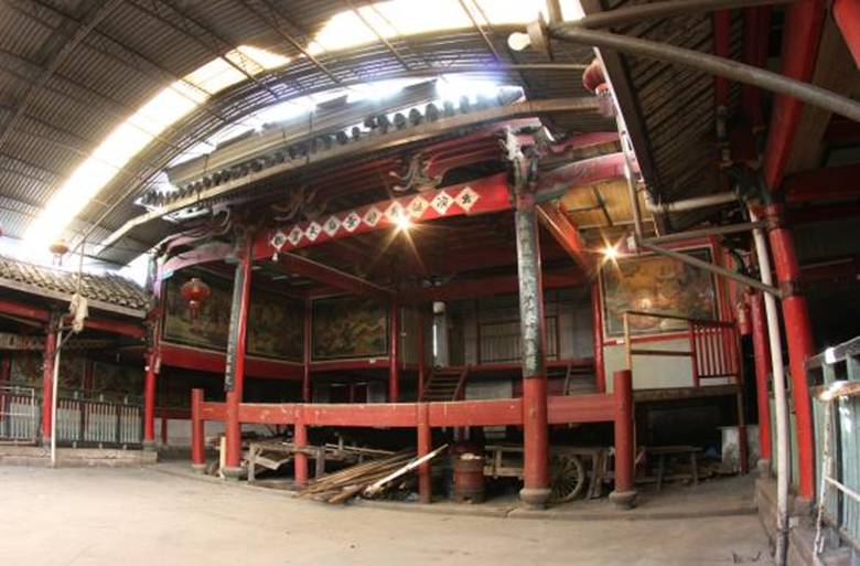 戏台与门厅共用一个硬山顶屋面,瓦当齐全,施虎头纹勾头、戏曲人物图案滴水。戏台后台及门厅二层的门壁上有戏单若干,演出的剧目有《蝴蝶泪》《青锋剑》《白罗衫》《双合缘》等。