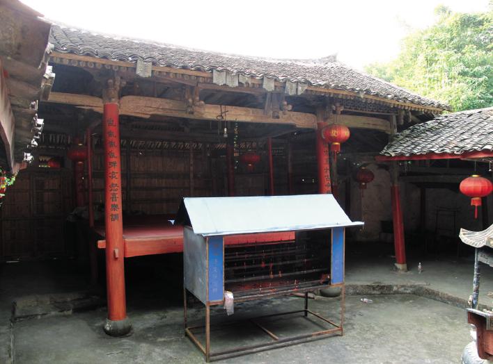 山皇娘娘宫戏台位于瑞安市仙降镇江溪办事处山皇村南城门下娘娘宫门厅内明间后檐。