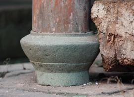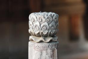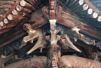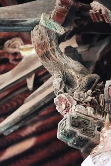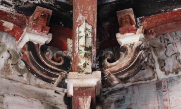台柱出双下昂,昂身刻成装饰性象鼻状。昂下置昂栓固定,栓头刻成白菜状。头昂两侧出异形斗拱,透雕花卉纹。每组双下昂间置挂落,透雕如意纹、蝙蝠纹、卷草纹等。出柱榫头刻成麻叶状耍头。转角处昂下置斜撑承托,斜撑圆雕凤鸟纹和花卉纹。斜撑下置丁头拱承托,拱上用压地隐起法雕刻卷草纹、长寿纹、花卉纹,花蕊处嵌有蓝色玻璃,现已有脱落。部分斜撑现已缺失。