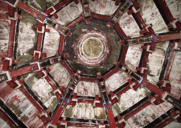 台柱柱头置圆栌斗,斗下柱间为额枋。枋头做卷杀,用压地隐起法和线刻法雕刻卷草纹。枋下置雀替承托,用压地隐起法雕刻卷草纹、蝙蝠纹、如意纹、盘长纹等。内额枋和穿枋间置编竹壁。额枋上立坐斗出正心瓜拱承托正心枋,坐斗斗底较短,向内出两跳上昂、施令拱承托井口枋,十字相交之井口枋围成斗八穹窿,竖向设斜拱向心汇合于井顶。穹窿六层,逐层递收,拱下置白菜状木销固定。斗拱间用连拱枋连接,连拱枋断面呈方形。井顶置双层圆盘枋,枋上环刻卷草纹。明镜处置盖板,盖板、井壁及四角平祺处均饰彩绘,现已模糊。