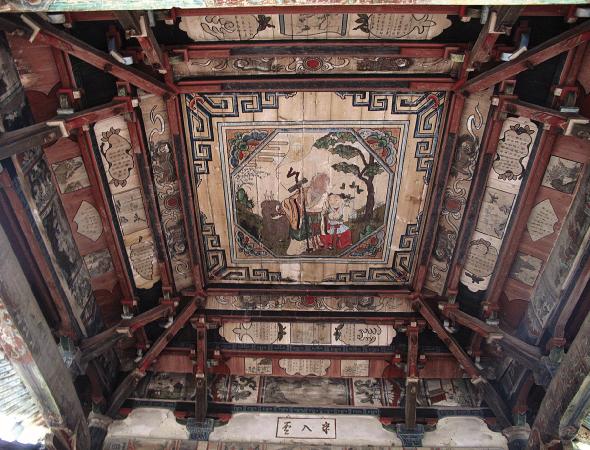 台柱柱头置圆栌斗,斗下柱间为额枋。额枋通体饰彩绘,绘有织锦纹、花卉图案、戏曲故事图案等。枋头做卷杀,线刻仙鹤纹、卷草纹。枋下置雀替承托,雕刻夔龙纹、回形纹等。雀替下置丁头拱承托,拱身刻花卉纹。穿枋和内额枋间置编竹壁,上书“半入云”。额枋上立坐斗出正心瓜拱承托正心枋,坐斗上绘回形纹。坐斗向内出两跳上昂承托天花枋,昂下置昂栓固定,栓头刻成白菜状、小鸟状。天花枋围成覆斗式藻井。天花内饰彩绘,绘如意回形纹、蝴蝶、福禄寿等图案。额枋和梁上绘戏曲故事彩绘和《三国演义》故事图案。棚壁上绘有类似苏式包袱的边框,有佛手、石榴、荷叶、画轴等。边框内绘喜上梅梢、瑞狮戏球图案,并书有大量唐代著名诗人描写女性或借女性抒发感情的诗句,如李白的《清平调三首》、朱庆余的《闺意》、张祜的《集灵台二首》等。