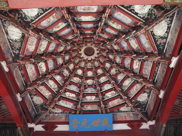 台柱柱头置圆栌斗,斗下柱间为额枋。枋头做卷杀,用压地隐起法雕刻和合二仙、卷草纹等。枋下置雀替承托,刻卷草纹、花卉纹、寿桃纹等。内额枋上悬匾额“盛世元音”。两侧置木刻件,书“去矣”、“来哉”。穿枋和内额枋间置编竹壁。额枋上立坐斗,斗底较宽。斗上开卯口直接承托正心枋。坐斗向内出斗拱、施令拱承托井口枋。令拱上出异形斗拱,雕刻戏曲人物形象。井口枋首尾连接围成井口,四周轩棚处彩绘和合二仙、八仙、三星天官、刘海戏金蟾等图案。藻井穹窿处竖向设十二条向心斗拱汇合于井顶,七层斗拱层层收拢。斗拱间用连拱枋连接,拱身曲线优美,拱底刻出短木销。第四层连拱枋上出异形拱,雕刻花卉和花篮状。枋上承井壁,绘花鸟以及竹林七贤、《西游记》、《三国演义》等故事图案,并绘有苏式包袱石榴纹,井顶盖板上绘花卉纹。