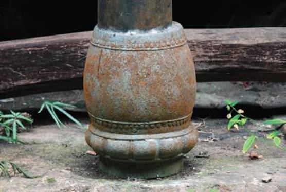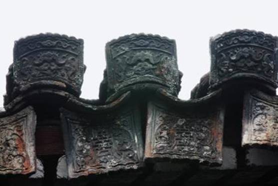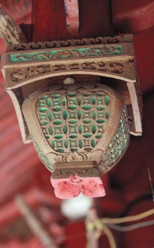 台柱出花篮垂柱和束腰覆莲垂柱承托双挑檐檩,花篮上环刻铜钱纹、蝙蝠纹、卷草纹和花卉纹等。垂柱间置花板,花板透雕凤鸟、牡丹花等图案和回形纹。戏台外侧转角处置斜撑承托挑檐枋,斜撑圆雕裴元庆、李元霸等戏曲人物形象。斜撑下置丁头拱承托,拱身刻卷草纹。出柱榫头刻出麻叶状耍头。屋面歇山造,翼角起翘,施双飞椽,椽身绘回纹、花卉纹等,椽头绘铜钱纹。檐口瓦当齐全,勾头的图案为蝙蝠纹、寿桃纹和花卉纹,滴水的图案为长寿纹和夔龙纹。