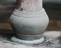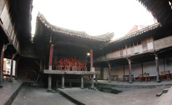 戏台坐西南朝东北,台基略低于两厢廊和正厅。方形平面,木结构表面多饰彩绘,台面铺设杉木板。四角立圆木柱,柱下置圆鼓形青石柱础承托。正面另添两根圆木撑柱辅撑台面,柱头不出台面,柱下置圆鼓形青石柱础承托。抱柱间用四面槅扇固定分隔前后台,绦环板已缺失。