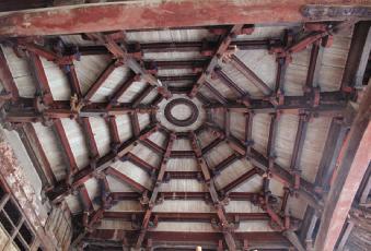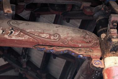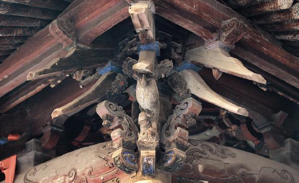 台柱柱头置圆栌斗,斗下柱间为额枋。枋头做卷杀,用压地隐起法雕刻卷草纹。枋下置水波纹雀替承托,雀替三面均施雕刻,刻有卷草纹和花卉纹等。雀替下置小斗和丁头拱承托,丁头拱上雕刻卷草纹和花卉纹等。穿枋和内额枋间用编竹壁。额枋上立坐斗出正心瓜拱置榫头承托正心枋,坐斗向内出两跳上昂、施令拱承托井口枋。昂下置昂栓固定,栓头刻成仰覆莲木销。十字相交之井口枋围成两层斗四穹窿,第二层加短趴梁、抹角梁形成斗八穹窿,越四层,逐层递收至明镜处。拱间设连拱板,拱板断面呈方形,顶层连拱板用弧形板连接。井顶置圆盘枋,枋上环刻卷草纹。井顶明镜处置盖板。