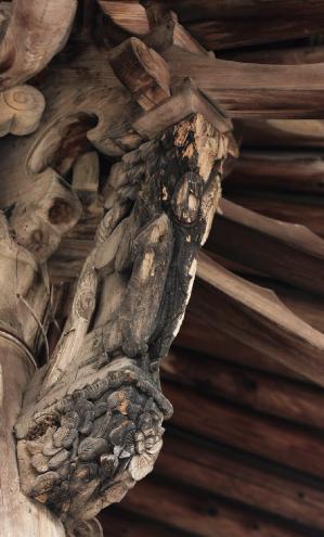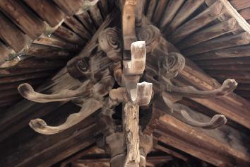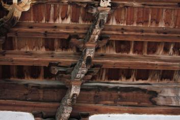 额枋上立坐斗出正心瓜拱承托正心枋,坐斗欹部较长,向内置斗拱出三跳、施令拱承托平祺天花。斗拱拱身刻成曲线状,拱身雕刻夔龙纹、莲花纹、葵花纹、卷草纹等。拱下置木销,刻成花篮状、瓜楞状、白菜状等。顶层斗拱上向内出异形斗拱,透雕花篮状、莲花状等。额枋上立坐斗出正心瓜拱承托正心枋,向内置斗拱出三跳承托平祺天花,天花内用天花枋做出双层八边形。