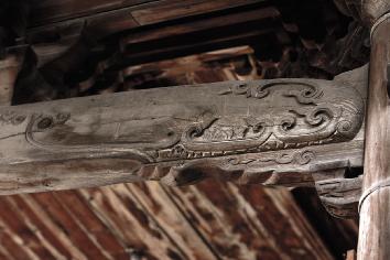 台柱出双下昂承托双挑檐檩,头昂两侧出麻叶状耍头。转角处昂下置斜撑承托,圆雕戏曲人物。斜撑下置丁头拱承托,丁头拱用压地隐起法雕刻花卉纹。屋面歇山造,翼角起翘,施双飞椽。脊上无脊兽,屋面较为简洁。