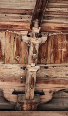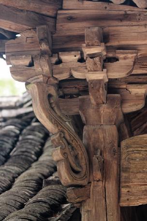 台柱柱头置方栌斗,斗下柱间为额枋。枋头做卷杀,不施雕刻。枋下置水波纹雀替承托。额枋上立坐斗出正心瓜拱承托正心枋,坐斗向内出两跳上昂承托平祺天花,昂底用昂栓固定,栓头刻成瓜楞状和束腰覆莲状。天花内用天花枋做成棋盘状。台柱向外出鸳鸯交手拱承托挑檐枋和挑檐檩,这在温州戏台中较为罕见。拱下置斜撑承托,斜撑圆雕夔龙状。屋面悬山造,脊上不施脊兽。檐口施瓦当,部分已缺失。勾头的图案为几何纹和尖叶纹,滴水图案为花卉纹。